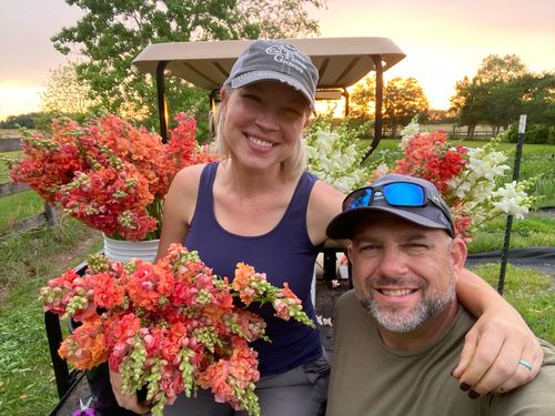 The above-mentioned wife, Kathy, is the Farmer. Kathy bought a home and a 3-acre farm in 2016, as a single mom, with dreams of being a farmer. When she married Patrick in 2017, P and K Farm was conceived. She started growing vegetables and herbs for her family and the local community. Adding flowers to jazz up her farmers market booth, she found that her petals were the most popular of her produce. She steadily expanded her flower production and now sells wholesale to florists and retail shops and directly to the consumer. I purchased 4 bunches of beautiful zinnias, sunflowers, and cosmos from Kathy last week and she delivered them to my door. I loved that the flowers were picked that morning, just like my shrimp swimming in the Bay, FRESH!