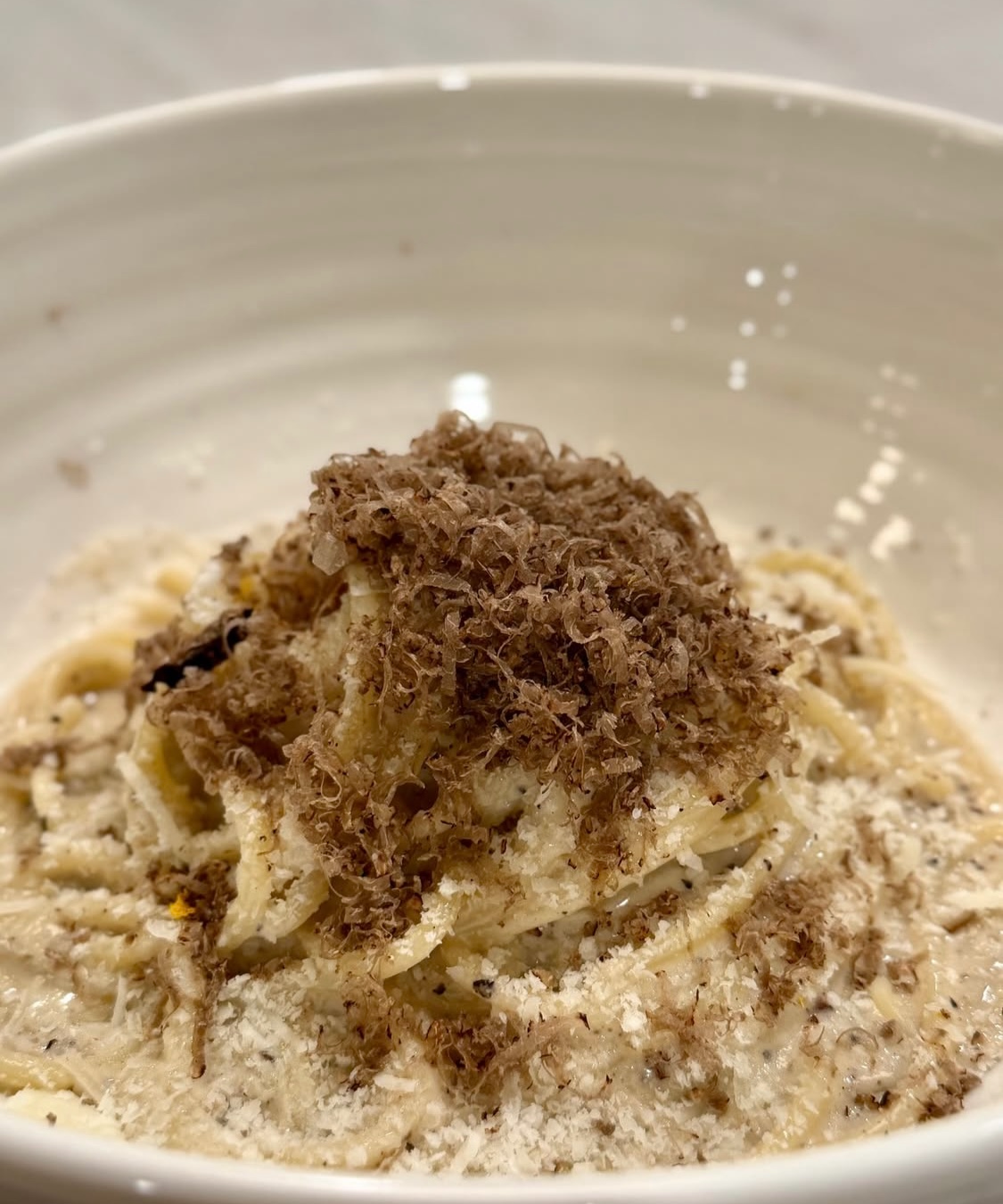 Roman-style chitarra pasta, DOP Pecorino Romano, black truffles