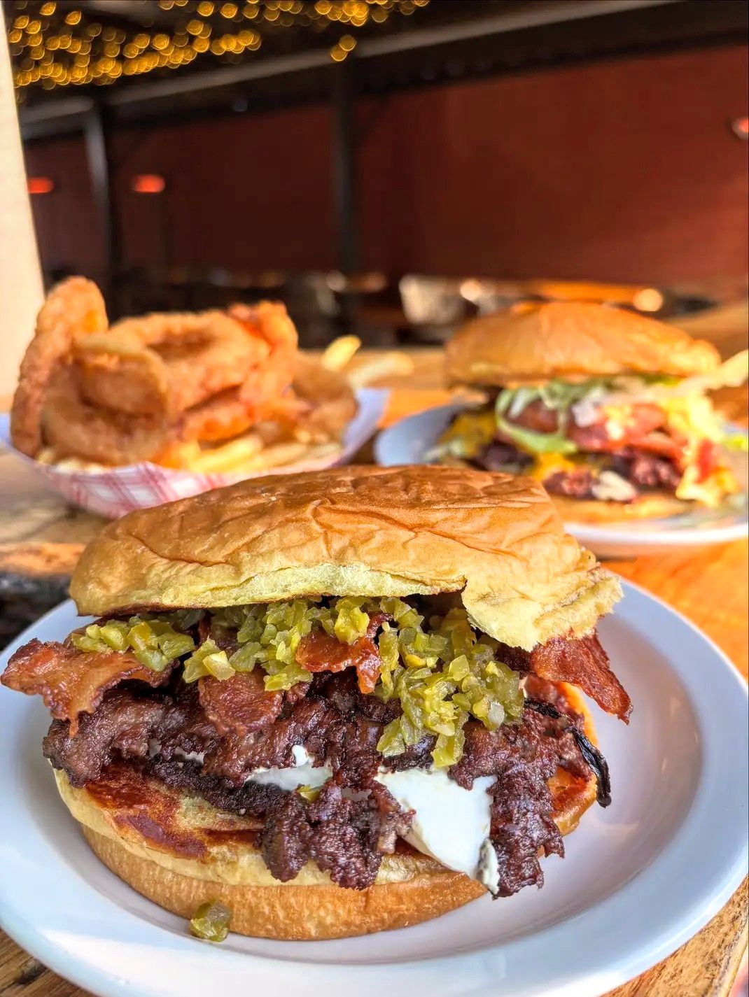 There are three kinds of burgers. All have two thin, griddle-seared patties on a pillowy bun with melted American cheese and dressed with shredded lettuce, sliced pickles, and a zingy house-made sauce that starts with a base of Thousand Island dressing. While that covers the basic model, deluxe versions include either sliced Conecuh sausage or a mixture of cream cheese and chopped jalapeños. Side dish options are fries, onion rings, or a combination of the two.